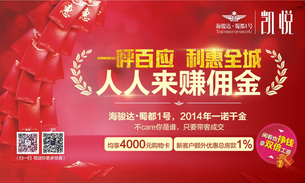 在今晨的“快閃”現(xiàn)場,一張紅色卡片在市民手中流傳,海駿達??蜀都1號“全民營銷”活動盛大開啟,為響應(yīng)“一呼百應(yīng),利惠全城,人人來賺傭金”的口號,老業(yè)主或推薦人可享受4000元同等價值的恒創(chuàng)百貨購物卡,新客戶可以享受1%總房款購房優(yōu)惠。海駿達?蜀都1號,2014年一諾千金!