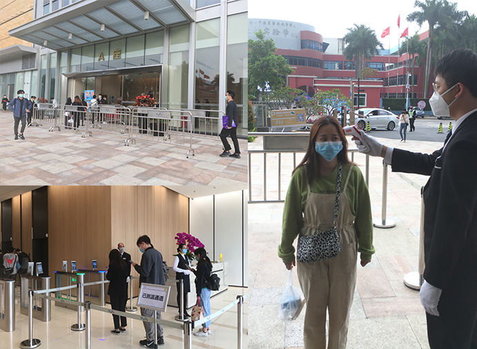 (每個入口實施人流管控,引導人員分流、避免交叉感染、保持一米的安全距離)