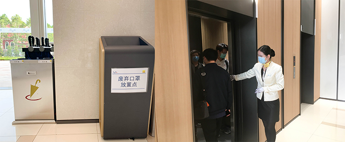 在一樓大堂設有“廢棄口罩”專用垃圾桶,將廢棄口罩與其他垃圾分類隔離處理,物業人員定時消毒